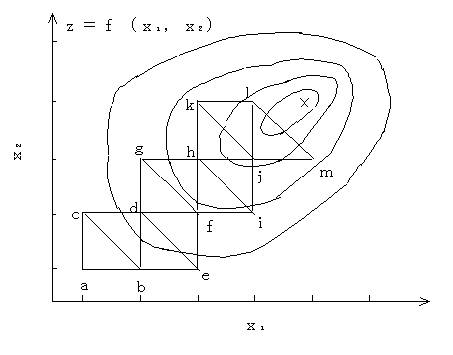 このようにあるシステムz =(x1,x2,…,xn)において,その要素x iが整数(離散値)であるときその目的関数zを最大にすることを考えると,図2.14のようにある点a(x11,x21,…,xn1)から出発して,傾斜ベクトル▽f(x1,x2,…,xn)の正の方向の点a 1(x11±1,x21,…,xn1),点a 2(x11,x21±1,…,xn1),…,点a n(x11,x21,…,xn1±1)のzの値を求め,そのなかで最大値を示す点a i(図2.14ではb)をめざす.